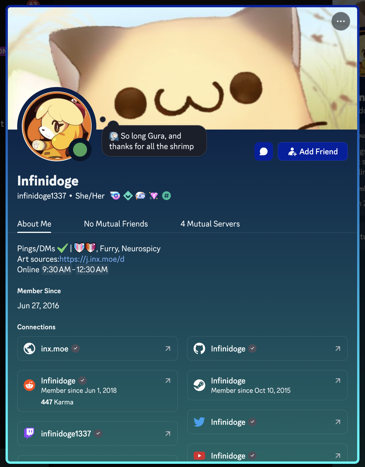 There is one person from that friend group who nearly completely overlaps the path I'm on in life. She literally studies CS at Purdue, now! And I only know this information because I saw her in the Furdue Discord server using the same username that she used on Steam back in 4th/5th grade. What??? It has genuinely been over 10 years since we talked, and somehow we ended up at the same school, studying basically the same subject.